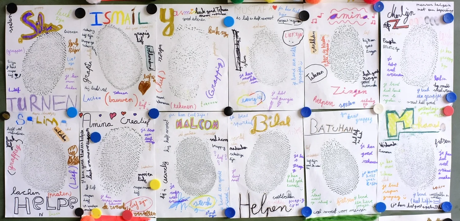 Via interactie en spel benoemen we gevoelens en emoties bij onszelf en onze klas -of groepsgenootjes. We verbeelden onze gevoelens en maken er een groot groepswerk van. Het doel van deze workshop is om complimenten te (leren) geven, krijgen en aanvaarden, en te leren dat onze zogenaamd minder goede eigenschappen altijd een positieve tegenhanger hebben. We ontdekken hoe we onszelf en de ander beleven en versterken via onze creativiteit, eigenwaarde en het groepsgevoel.